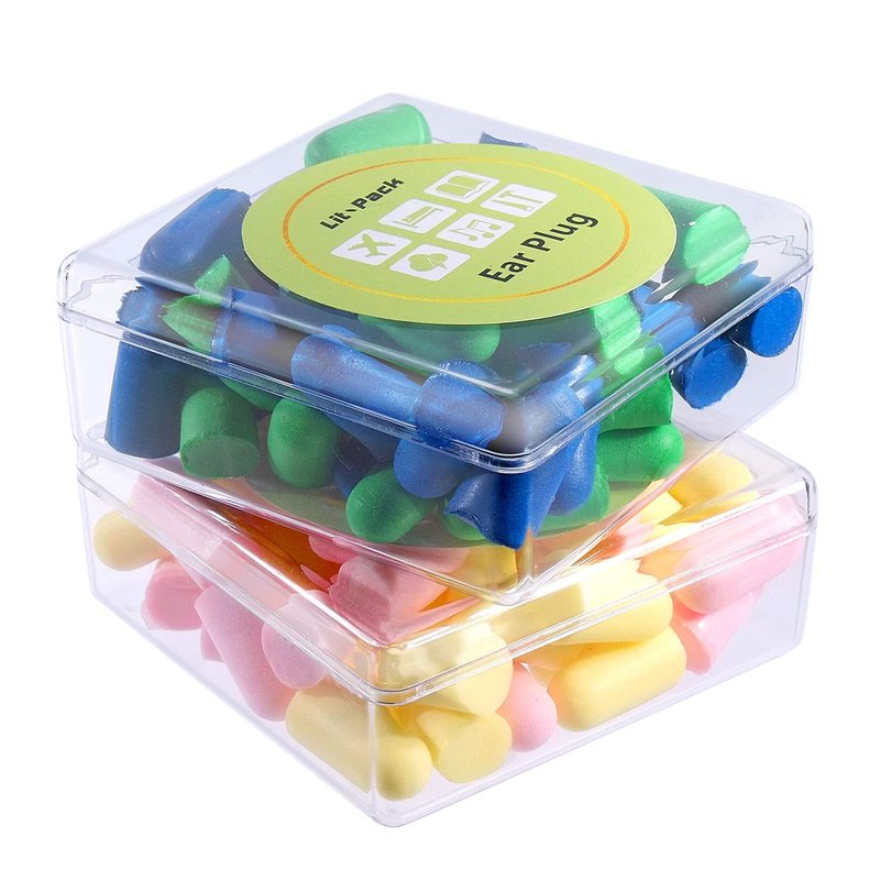 The earplugs are made of Super Soft and non-toxic PU Foam, For Sleep, Work, Study wherever you need quiet. Note: Slow Rebound Foam Ear plugs to fit in ear well. 24 pair 2 color ear plug in transparent case and 2 pair in a small travel case for giftt.