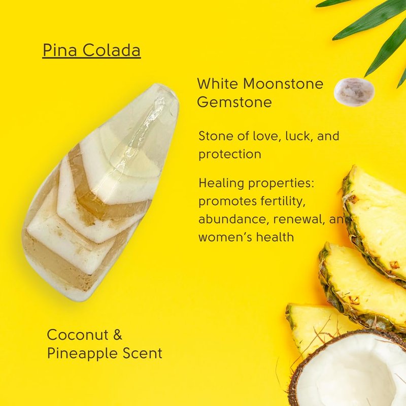 - Tropical Elegance: Our Pina Colada rock soap is infused with coconut and pineapple scent and includes a hidden white moonstone gemstone known for its calming properties. This crystal soap feels like a mini vacation every time you use it.
