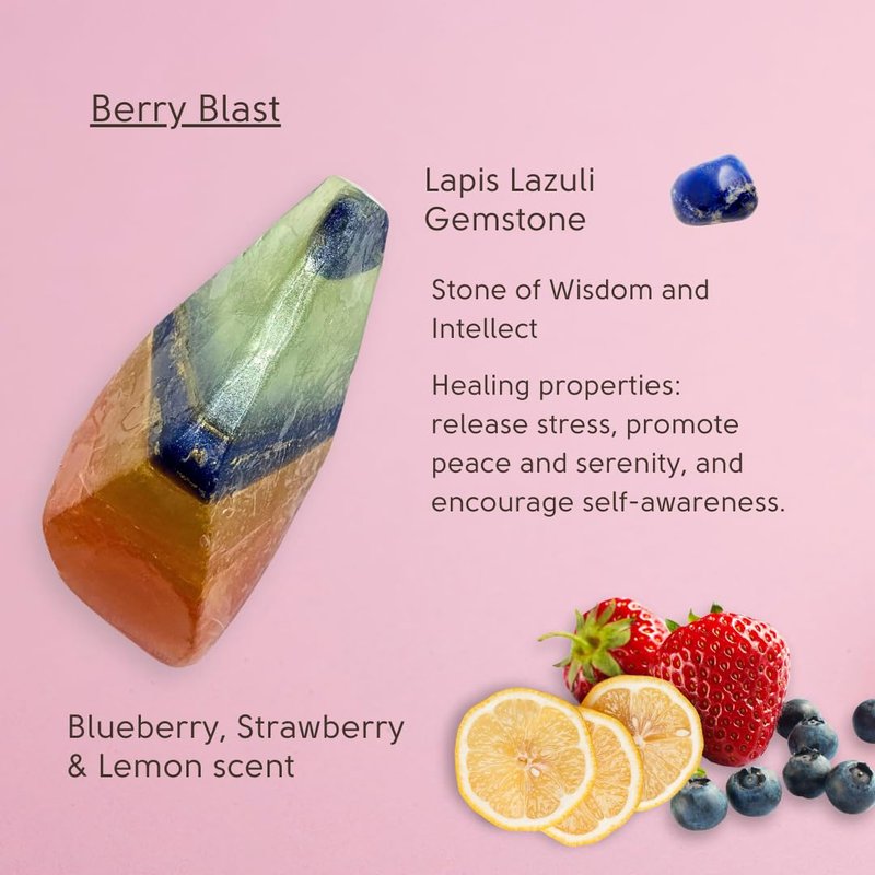 - Berry Blast Delight: Experience luxury with a fruity explosion of blueberry, strawberry, and lemon scents with lapis lazuli gemstone that symbolize wisdom and truth. This diamond soap not only cleanses but also inspires a sense of inner peace and clarity.