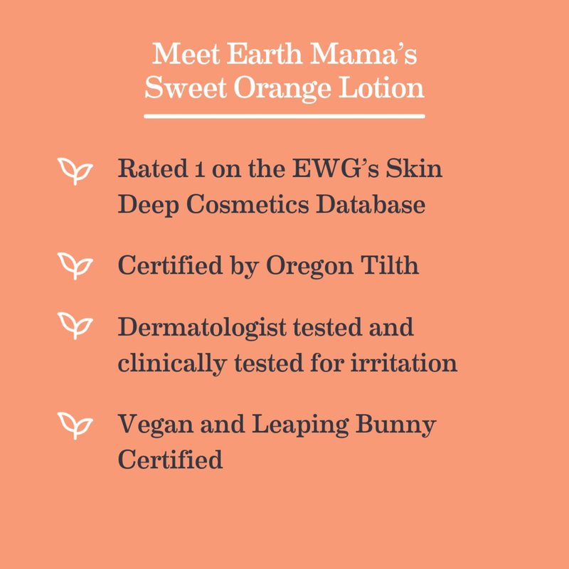 - NON-IRRITATING & CLINICALLY TESTED: Earth Mama’s Sweet Orange Baby Lotion is NSF/ANSI 305 Certified by Oregon Tilth, Leaping Bunny Certified and Plastic Neutral.