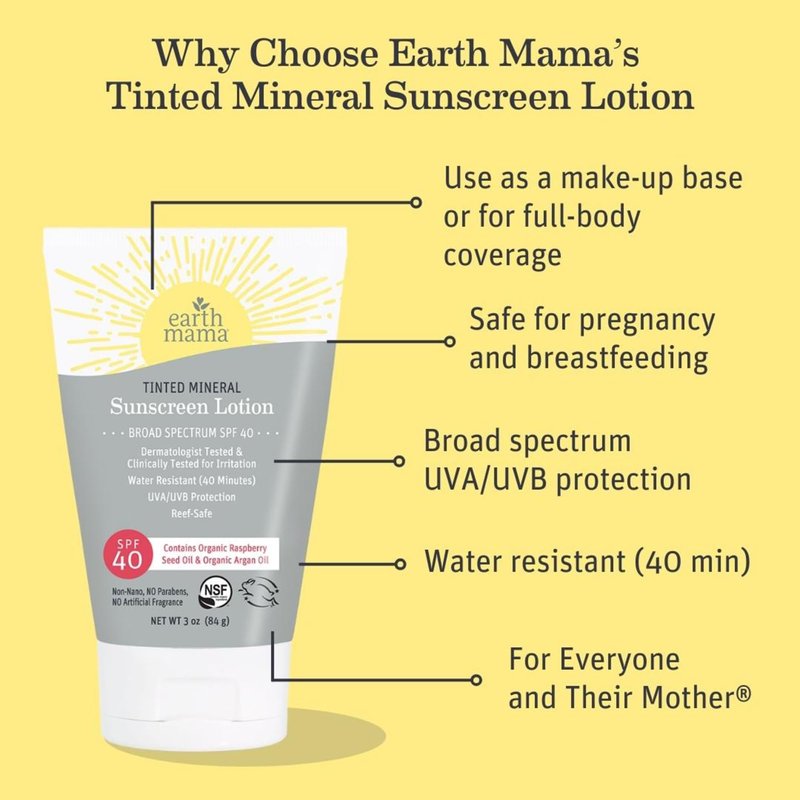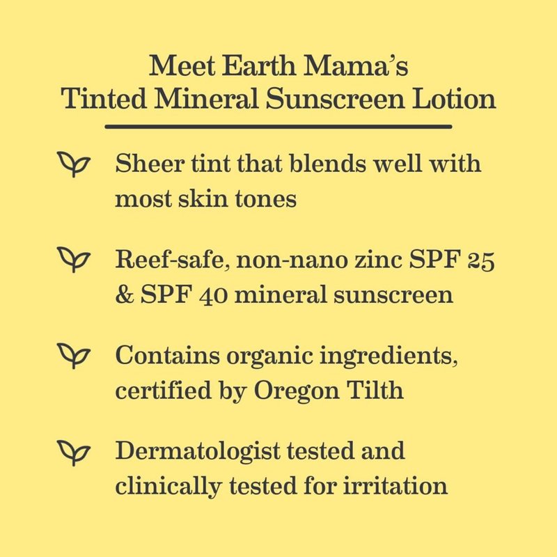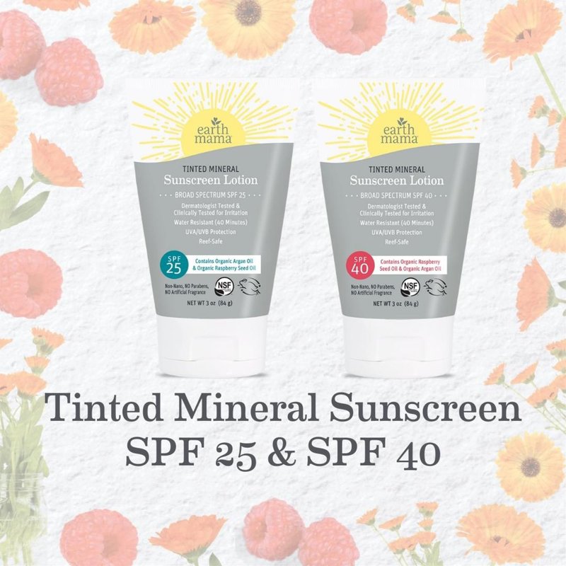 - TIPS FROM MOMMA: Love the tint, but looking for some extra protection from the sun and blue light exposure from digital screens? Try Earth Mama's Tinted Mineral Sunscreen in SPF 25 for your baby, toddler, child or teenager too! NSF/ANSI 305 Certified by Oregon Tilth.