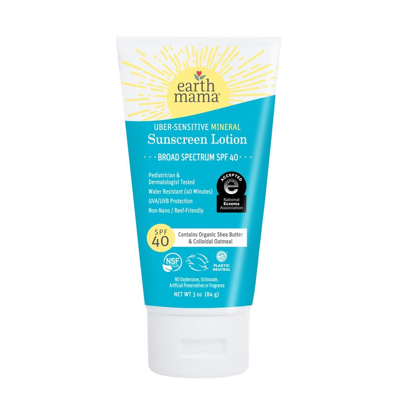 Earth Mama Uber-Sensitive Mineral Sunscreen Lotion SPF 40 | Reef Safe, Non-Nano Zinc, Contains Organic Colloidal Oatmeal | Steroid-Free Eczema Cream for Baby, Kid & Family, 3-Ounce