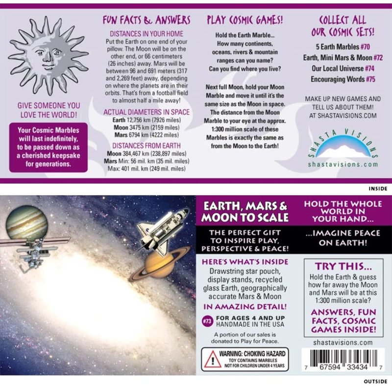 The perfect gift to inspire play, perspective, and peace. An educational insert card is included with fun facts and cosmic games. Can you guess how far away the Moon is at a 1:300 million scale? This box set is sure to challenge your knowledge of our Earth and its two closest celestial bodies.