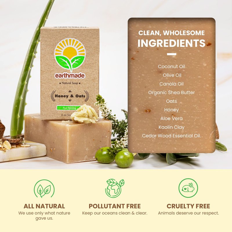 - Helps Skin Regenerate after Tanning - Naturally formulated for post-tanning, EarthMade's Honey and Oats natural soap bar addresses the harsh effects of tanning and harmful Uv rays. It contains essential oils that are gentle for all skin types.