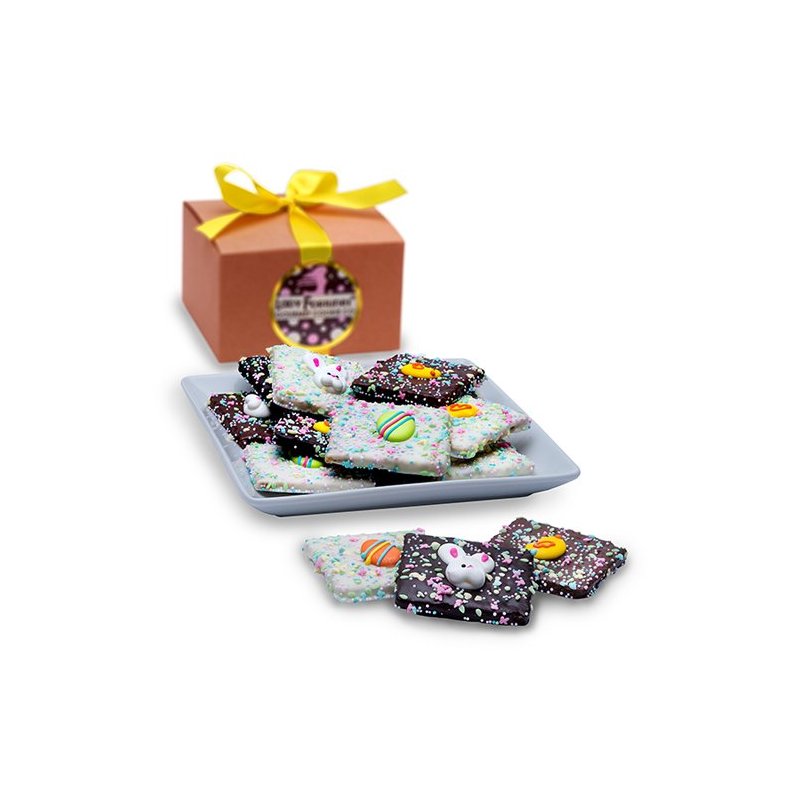 This delicious arrangement of our delicious half grahams is sure to leave them wanting more! Half grahams are dipped in creamy belgian chocolate, Milk, Dark White, and smoothered in festive sprinkles and hand crafted royal icing decor. Each Graham is individually wrapped and placed inside a lovely brown matte box and finished with a lush satin ribbon and decorative label.