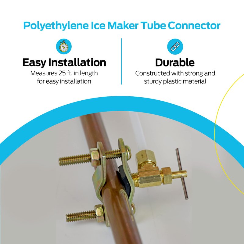 - WHAT IS INCLUDED: Universal ice maker installation kit includes (1) 25 ft x 1/4 inch polyethylene tube roll, (1) self-piercing saddle valve, (1) 1/4 inch compression x 1/4 inch compression union, (2) brass tube inserts, and (2) Delrin sleeves