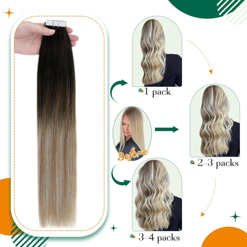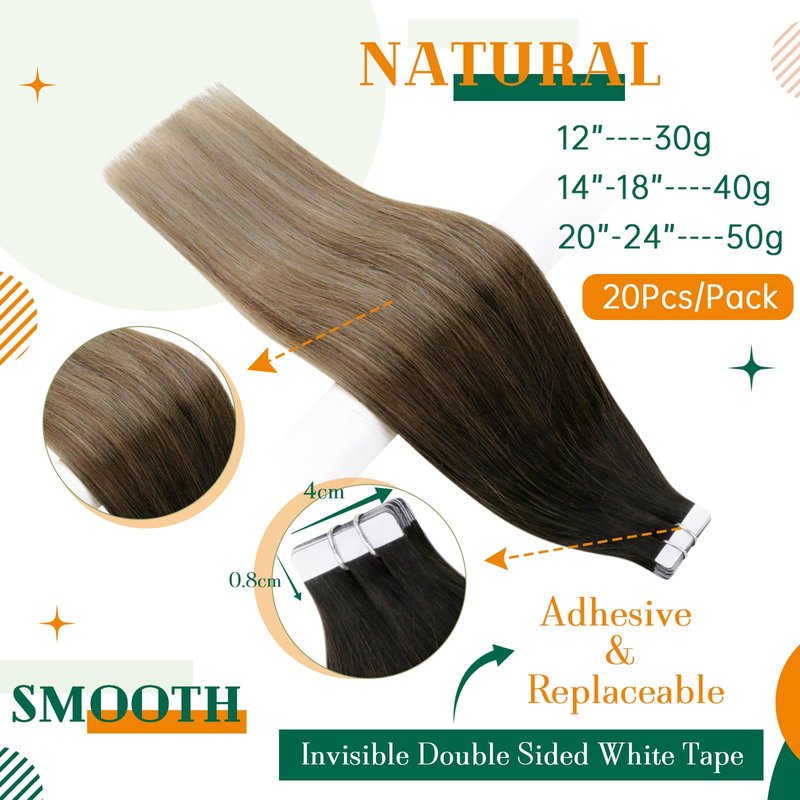 - 【Specification: Length & Weight】 Weight: 12” 30g, 14”-18” 40g, 20"-24" 50g, total 20 pieces. Thick Ends: Easyouth Tape in Hair Extensions is thicker at the ends, so if you have normal hair volume, about 1-3 packs can make a full head. Our uniquely delicate acid-free treatment process ensures the hair will remain healthy, glossy and in excellent condition throughout its life.