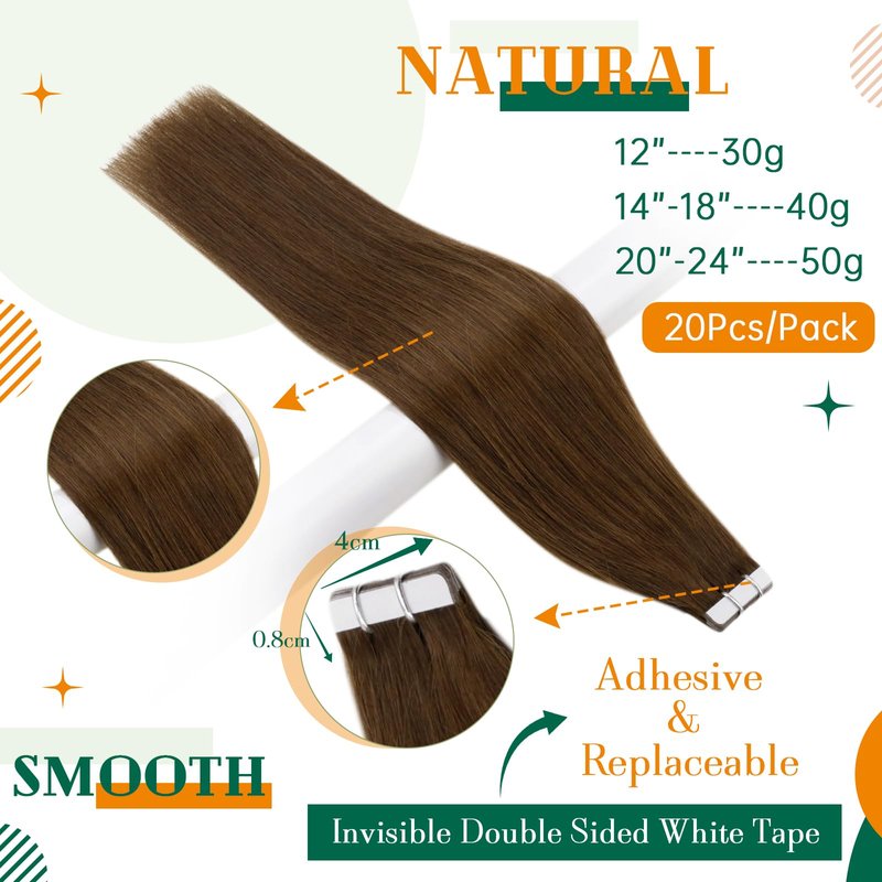 - 【Specification: Length & Weight】 Weight: 12” 30g, 14”-18” 40g, 20"-24" 50g, total 20 pieces. Thick Ends: Easyouth Tape in Hair Extensions is thicker at the ends, so if you have normal hair volume, about 1-3 packs can make a full head. Our uniquely delicate acid-free treatment process ensures the hair will remain healthy, glossy and in excellent condition throughout its life.