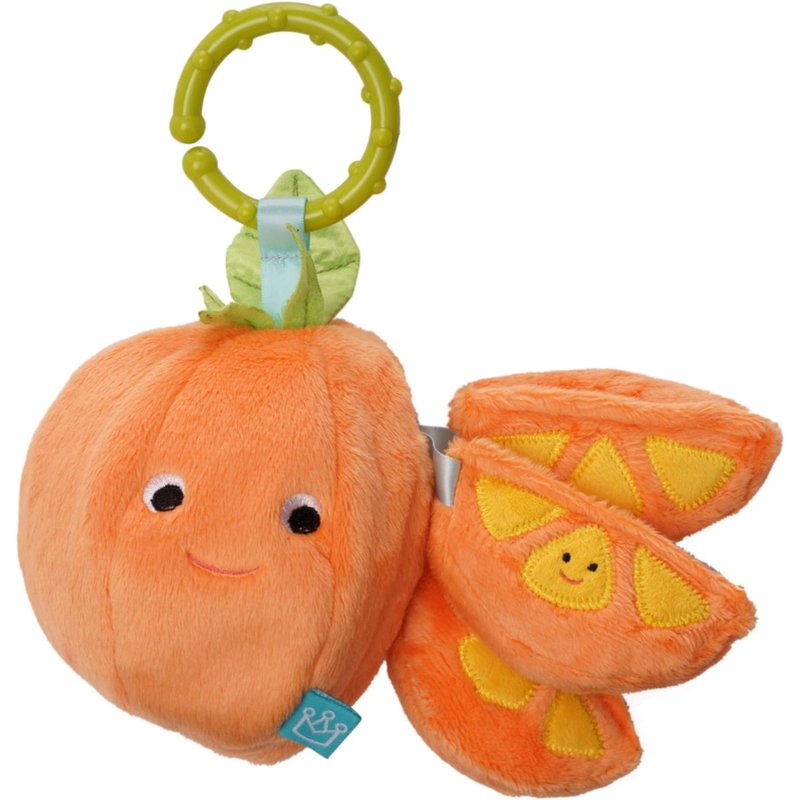 - Fruity fun for little ones; Orange and Lemon Take Along Toys have embroidered facial features and soft fabric fruit slices. Tethered by silky-soft ribbons, each slice includes unique features - rattle, squeaker and crinkle textures. With multiple textured fabrics, silky leaves and interior lining, they easily attach to carriers and more with their textured plastic C-clip that doubles as a teether. Great for on-the-go play while encouraging motor development & cause and effect learning.