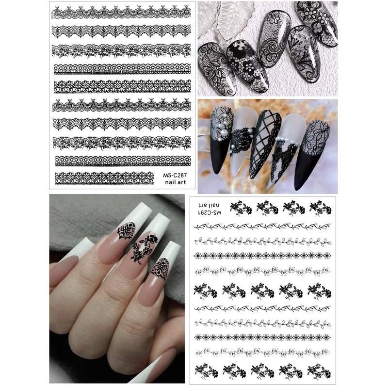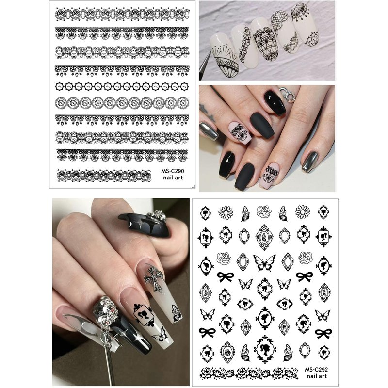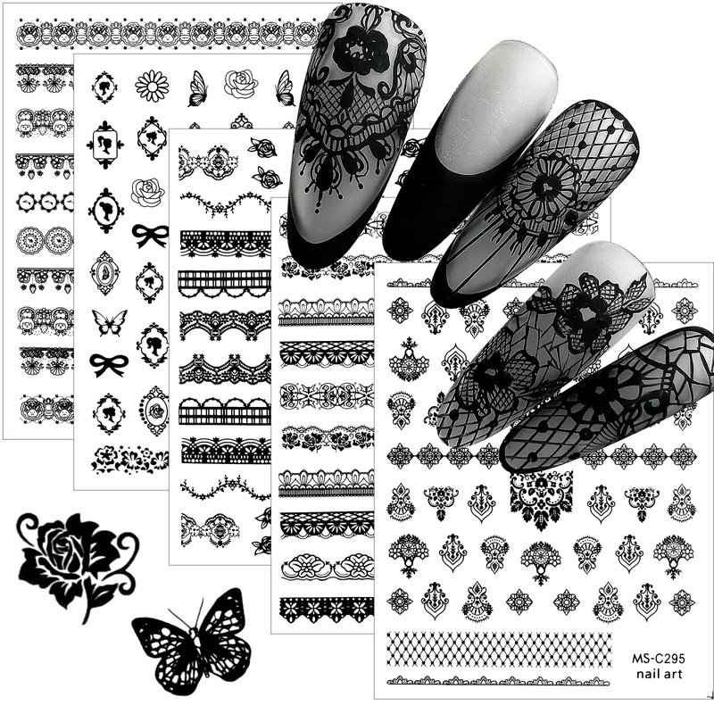 - Package List: You will get 9 sheets black lace nail sticker decal, which have many assorted patterns, includes lace, flowers, butterflies,bowknots, etc. Small piece nail art decals, perfect suitable for nail or nail tip. Fit for most nails