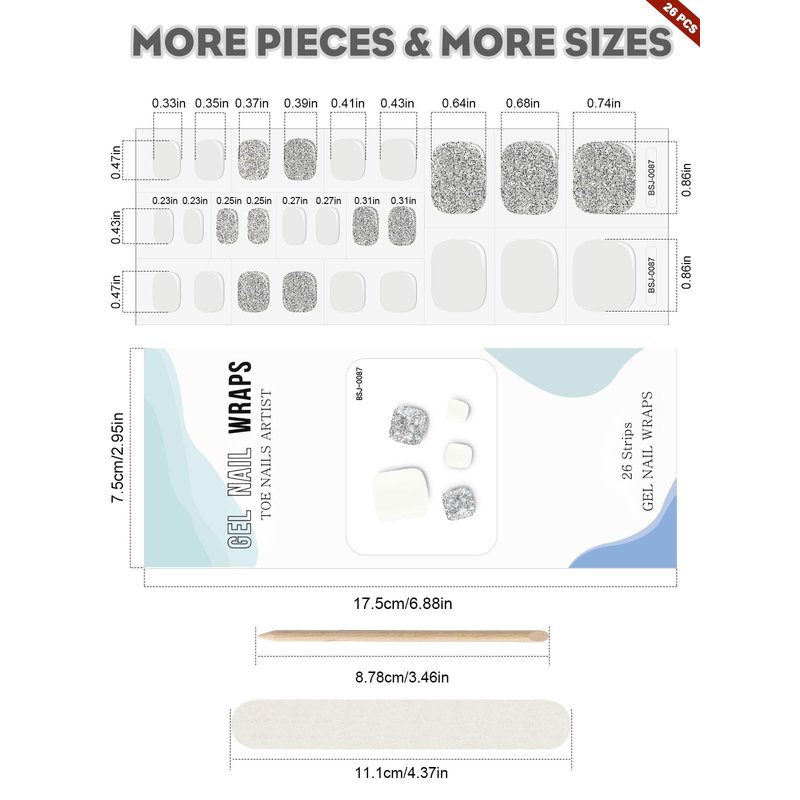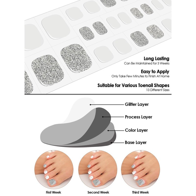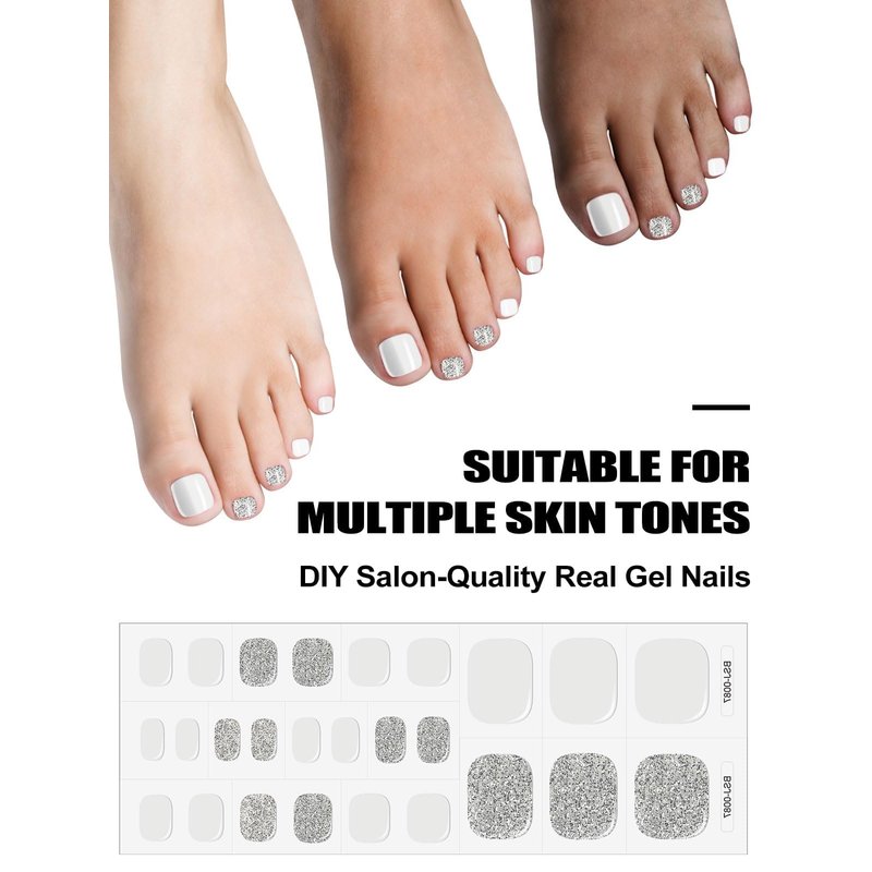 - π Supports Various Nail Shapes: Gel toe nail wraps can be trimmed into a variety of shapes such as round, square and other shapes you like. Stick on nails, cut off the excess, file down, then cured by UV lamp for 60 seconds. It takes about 15 minutes to complete nail polish choice for nail lovers. Note: If it is not fully cured, the curing time can be extended by 60 seconds.