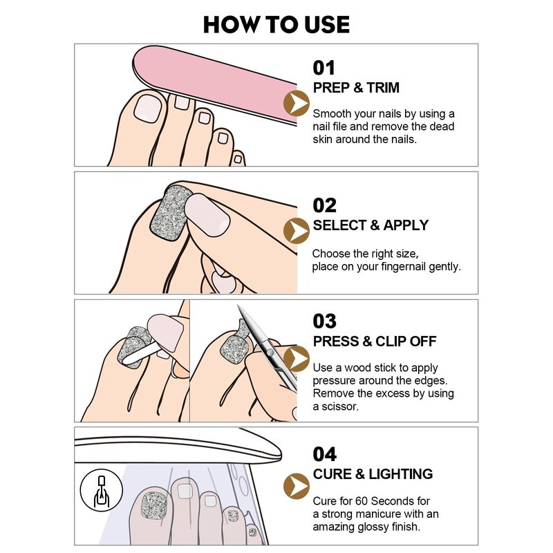 1.Clean and smooth your nails (Package include nail file);<br>