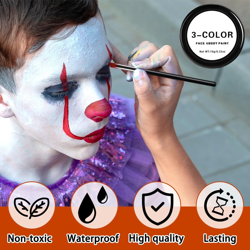 - Widely use: You can use these 3 color face and body paint to dress up as a clown,vampire or witches for any special occasion,such as Halloween party, Day of the Dead,Carnivals festival, stage performance, cosplay-themed parties,special effect show,film parties and haunted house and so on.