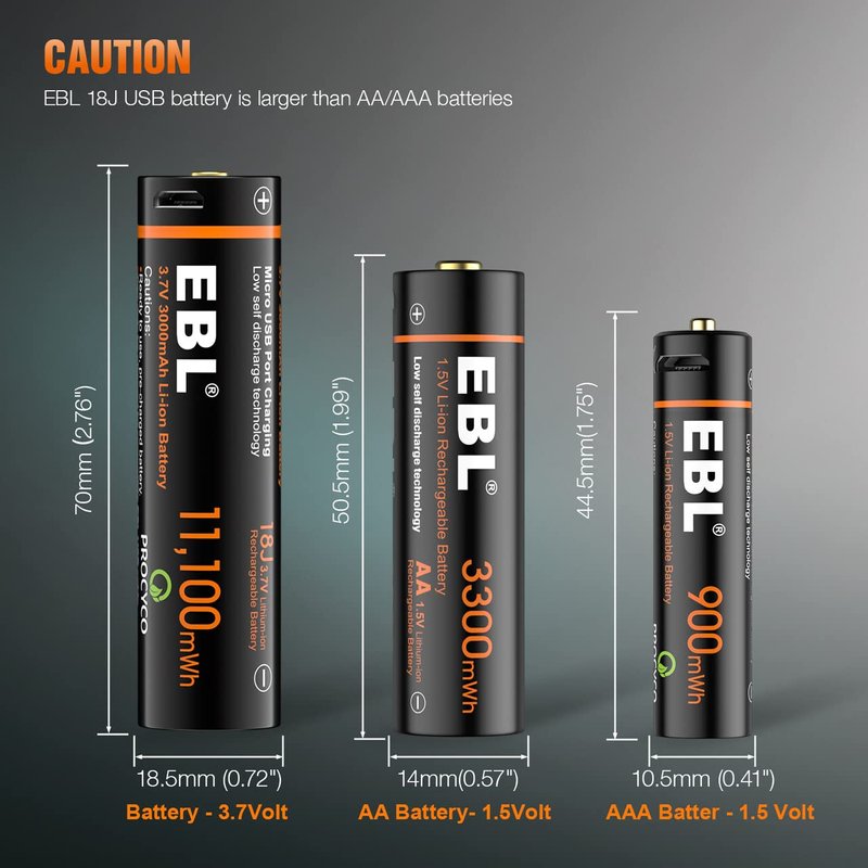 - EBL 18J Battery - 3.7V lithium batteries(SIZE: 18.5MM x 70MM, battery type: button top) STATEMENT: This product is NOT sold with restricted lithium-ion standalone batteries. This product does NOT include lithium-ion battery types: 14500, 16340, 18650, 20700, 21700 and 26650.