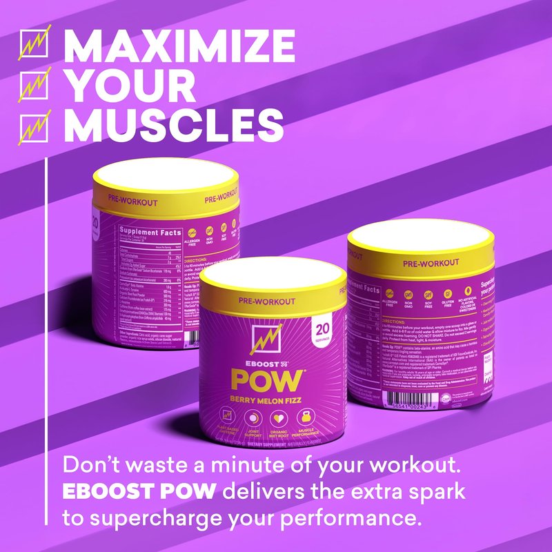 EBOOST POW Natural Pre Workout Powder - 20 Servings - Berry Melon Fizz - Pre Workout Supplement for Performance, Joint Mobility Support, Energy, Focus - Men & Women - Non-GMO, Gluten-Free, No Creatine