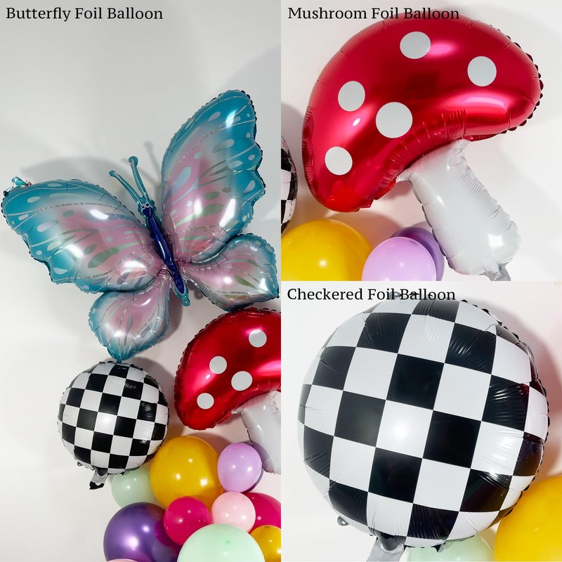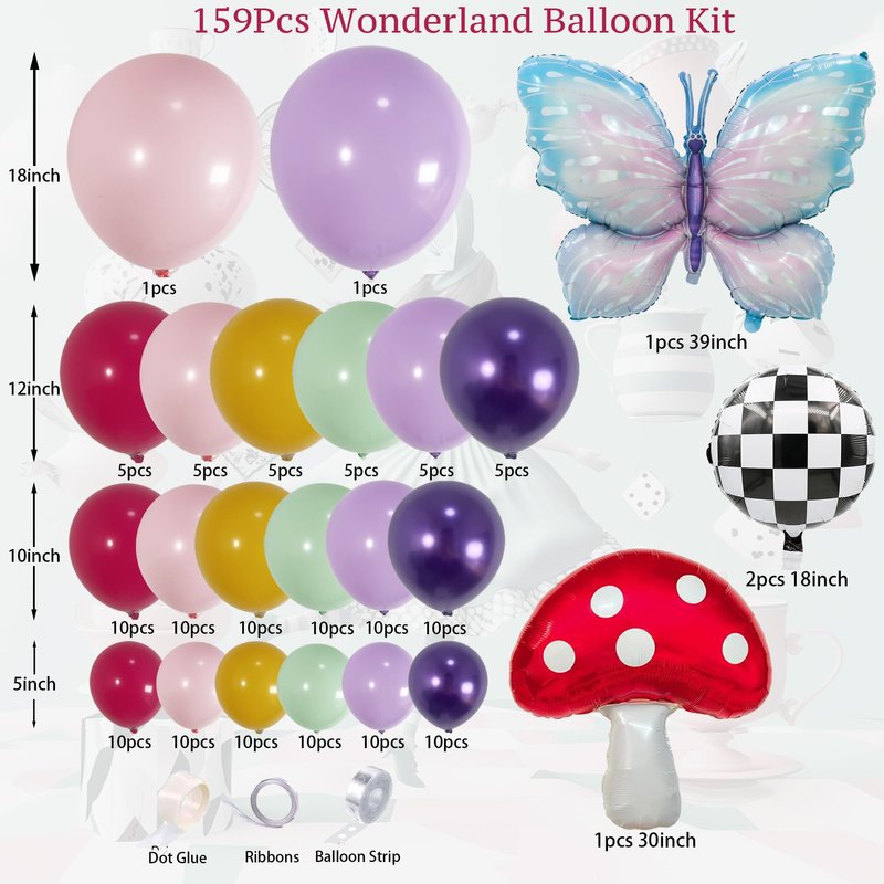- 【Wonderland Balloon Kit】: This set includes a variety of balloons in different sizes: 2pcs 18" balloons, 30pcs 12" balloons, 60pcs 10" balloons, 60pcs 5" balloons, featuring colors like hot pink, pink, mustard yellow, pastel green, pastel purple and metallic purple. It also comes with 1pcs butterfly foil balloon, 1pcs mushroom foil balloon and 2pcs checkered foil balloons. Perfect for tea parties, fairy birthday decorations, and wonderland party decorations.