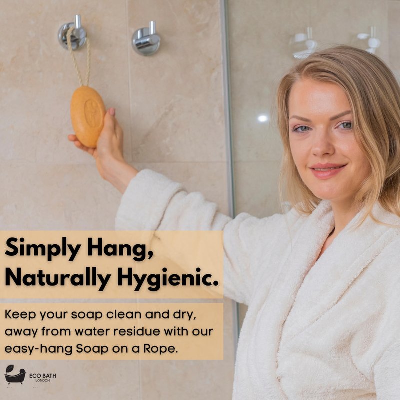"Enhance your shower experience with the Eco Bath Apricot Soap on a Rope, a nourishing body wash bar infused with the moisturizing benefits of shea butter. This natural shower gel bar provides a rich, creamy lather that gently cleanses and hydrates your skin, leaving it soft, smooth, and rejuvenated. The delightful apricot scent offers a refreshing and uplifting shower experience, perfect for invigorating your senses. The Eco Bath Apricot Soap on a Rope is designed for convenience and longevity. The sturdy rope handle allows you to hang the soap bar to dry between uses, ensuring it stays fresh and lasts longer. Made from high-quality natural ingredients, this soap bar is gentle on the skin, making it suitable for all skin types. Whether you’re looking to elevate your daily shower routine or seeking a natural alternative to conventional body washes, this soap on a rope is a perfect choice. Eco Bath London is dedicated to creating high-quality, eco-friendly products that are sustainably sourced. The Apricot Soap on a Rope is crafted from natural and biodegradable materials, ensuring a safe and environmentally friendly way to care for your skin. Its compact and lightweight design makes it ideal for home use or travel, allowing you to maintain your skincare routine wherever you go. Experience the nourishing cleanse and hydration with this premium soap bar and achieve healthier, more radiant skin."
