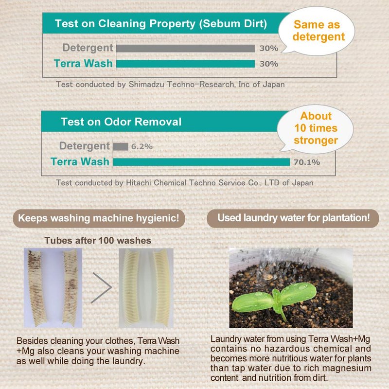 - [ Laundry Revolution ] Invented by innovative skill in Japan, Terra Wash +Mg is a detergent substitute that washes clothes without detergent and can be reused for 365 washes! Saves tons of plastic bottles and money!