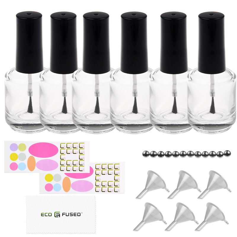 ECO-FUSED Transparent Clear Empty Nail Polish Bottles - with Dupont Brushes - Set of 6 - Also Includes 6x Plastic Funnels, 12x Mixing Balls and 20x Sticker Labels - Making your Own Nail Polish