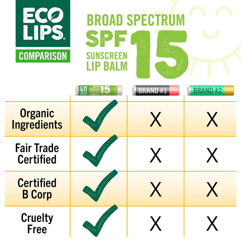 When you're headed outside to enjoy all-weather activities, your sensitive lips are exposed to the elements. Protect and nourish them with Eco Lips SPF Broad Spectrum Sunscreen lip balms. Made with organic aloe vera and Fair Trade Certified, organic coconut oil and cocoa butter, these lip balms provide soothing protection from harmful UV rays. Moisturize your lips so you can do what you love in the sun every day of the year. Contains 2 each SPF 15 Berry, SPF 15 Mint, SPF 30 Sport (vanilla) Whether you're backpacking, kayaking or hitting the beach, your sensitive lips are exposed to the elements. Protect and nourish them with broad spectrum protection. Made with aloe vera, coconut oil and 19.5% active sunscreen ingredients, these balms provide protection from harmful UV rays & moisturize your lips, so you can do what you love in the sun without worry. This 6-pack lip balm pack features 2 of each flavors: berry, sport (unflavored) and mint. Packaged in our plastic-free Plant Pod packaging!