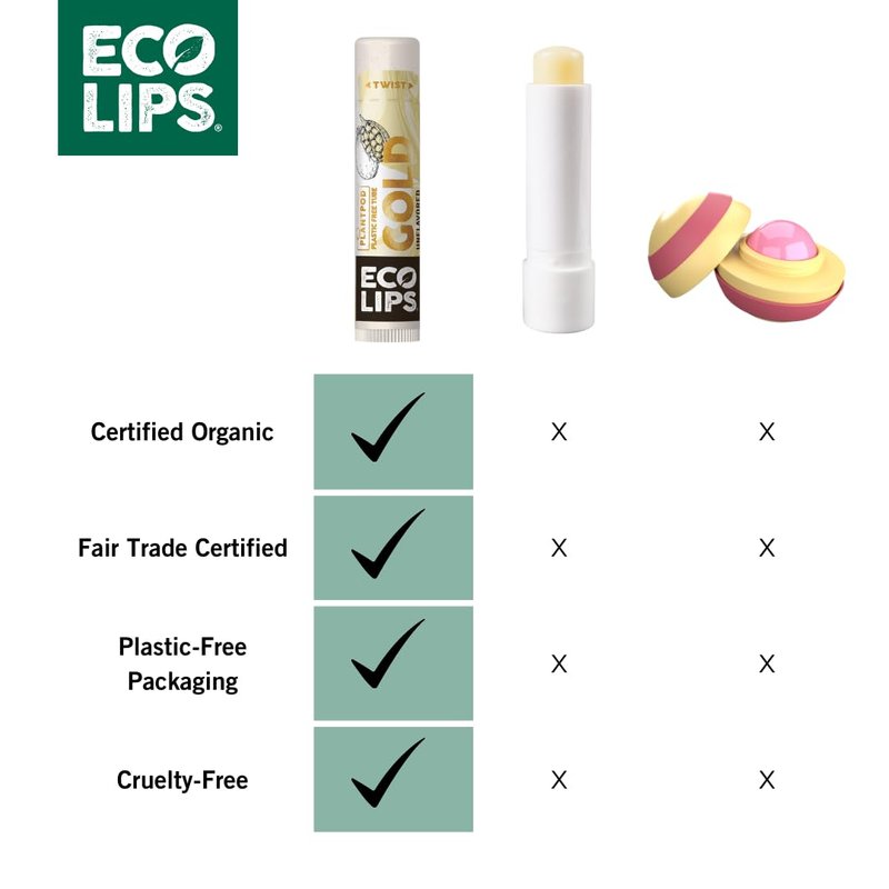 In search of an all-around lip moisturizer without added flavors, colorants or aroma? Gold is the gold standard. Made with Certified Organic baobab oil, this nourishing lip balm effectively moisturizes, protects and soothes dry, chapped lips. It's great for those with allergies to shea butter or those with sensitive lips. Eco Lips was the first lip balm company to bring organic baobab to the market. Baobab oil has a beautiful balance of palmitic, oleic and linoleic fatty acids that make it a great skin care oil. It absorbs quickly into the skin and is non-greasy. Eco Lips has always been one step ahead of the game when it comes to product and package innovation, and we are proud to announce the launch of Plant Pod, our plastic-free, plant-based lip balm tube. Thanks to this groundbreaking technology, Eco Lips lip balms are now made from 100% plant material and can be disposed as general waste after use.