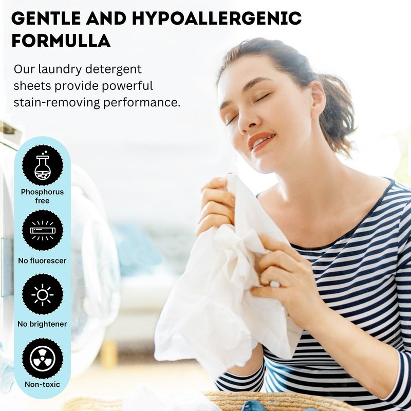 - COMPOSTABLE PACKAGING: Ideal for traveling and small laundry rooms, our no-drip, no-mess detergent soap sheets, reduce plastic bottle waste. Your clothes will come out of the wash smelling fresh and clean, without any reactions to sensitive skin.