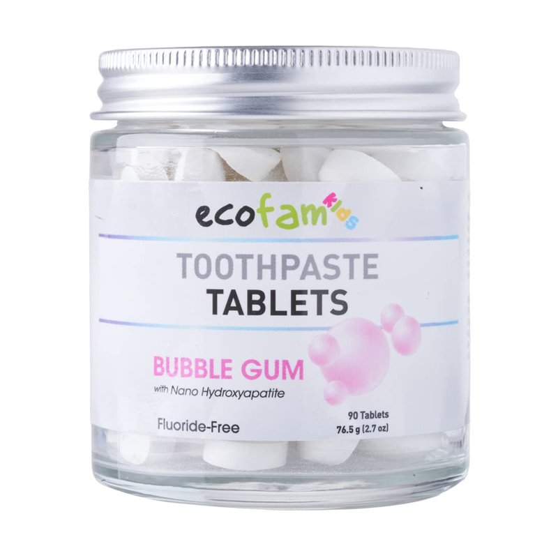 Ecofam Kids Toothpaste Chewable Tablets - 90 Natural Xylitol Tabs - Zero Waste Glass Jar - Travel Friendly - Fluoride-Free -with Nano Hydroxyapatite -Vegan - Made in The USA (Bubble Gum)
