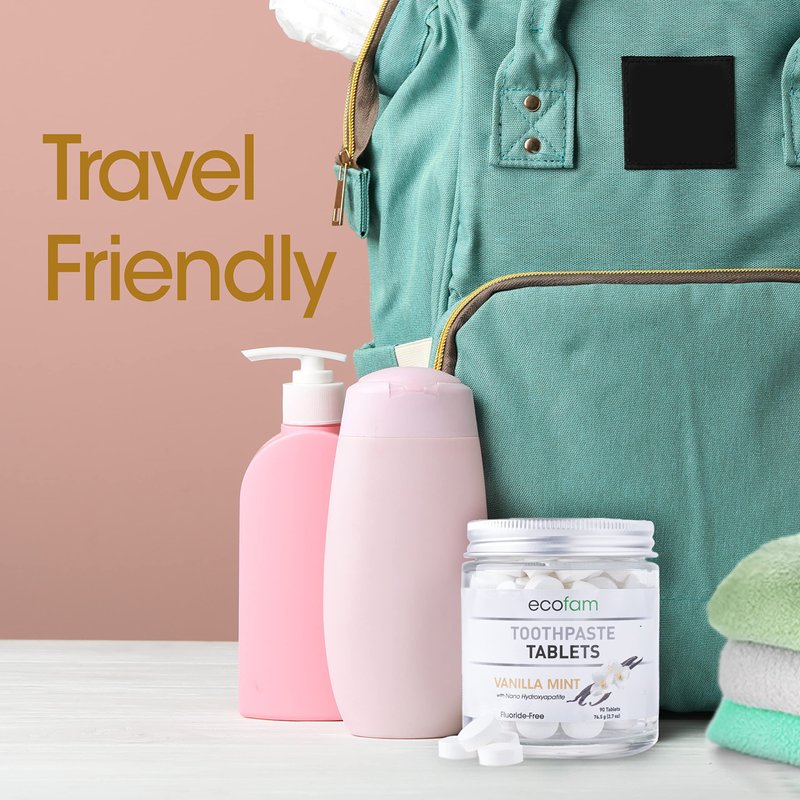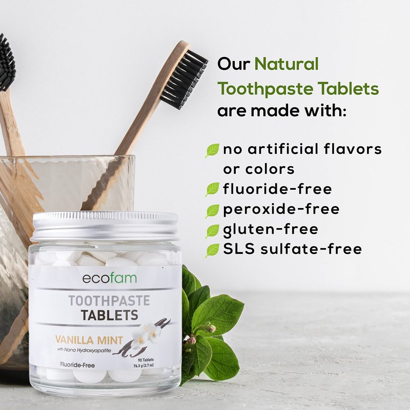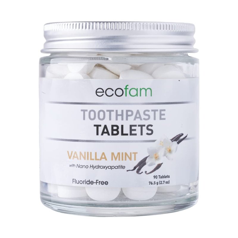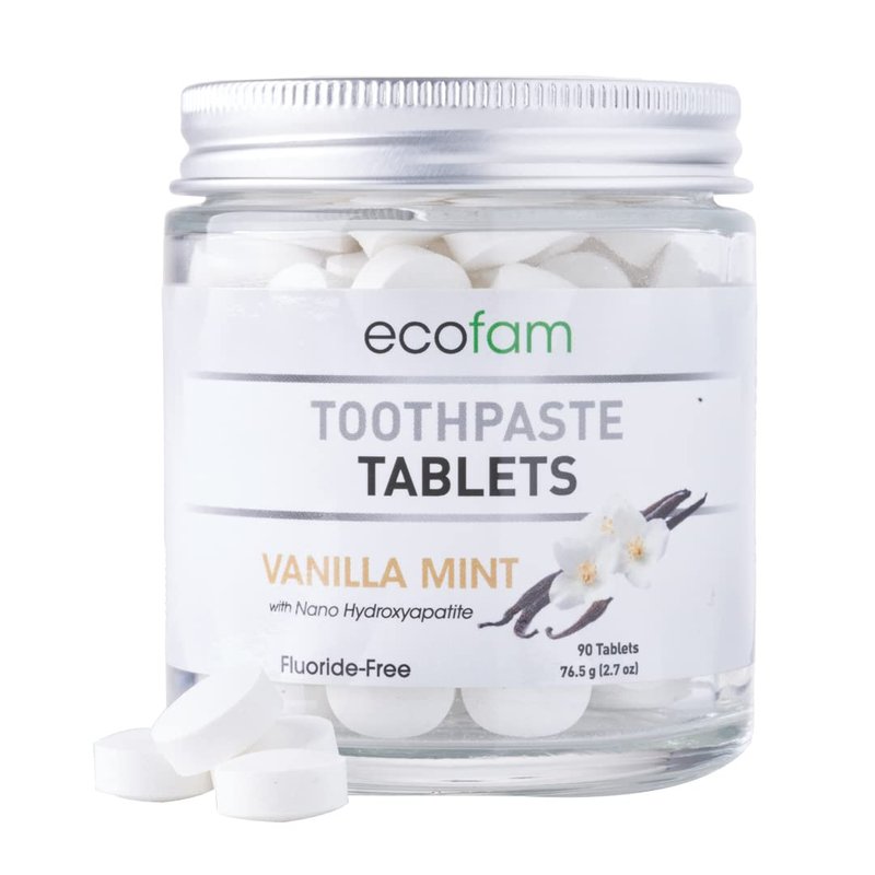 EcoFam toothpaste features a chewable, waterless design that allows you to brush your teeth anywhere, anytime, without carrying bulky toothpaste tubes. To use, place one tablet in your mouth and crush it with your teeth. Wet your toothbrush and brush your teeth for about 2 minutes. The paste will foam slightly as you begin to brush. Rinse thoroughly and enjoy your bright, healthy smile! Available in Peppermint, Vanilla Mint, Wintergreen, Cinnamon, Bubble Gum, and Strawberry Kiwi Made with Nano Hydroxyapatite and xylitol.