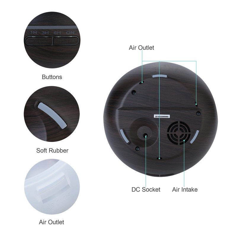 EcoGecko’s Dark Wood Grain Eseential Oil Diffuser produces ultra fine and smooth uniform mist. Feel like you are in an elegant spa in the comfort of your own home. Whisper Quiet Operation: noise as low as 35dB, so it won't disturb your relaxation. Auto Shut-Off: When the water runs out, the diffuser will be shut off automatically by its built-in detector. Night light: 7 Color Changing Mood Light, each of which has Bright and Dim mode, and can be set to 1 color or rotate through all of the colors. Ultrasonic Diffusing Technology: Different form traditional way of heating, combustion type hot fog, the Ultrasonic Diffusing Technology does not harm the essential oil of any ingredients, which allow you to achieve higher quality aromatherapy. Timer Setting: Press the "Mist" key to choose timer from 1H, 3H, 6H or On(Continuous Mist). Mist Control: Press the Mist button, one beep for strong mist, two for gentle mist. Working Time: 6 hours in strong mist, 10 hours in gentle mist.