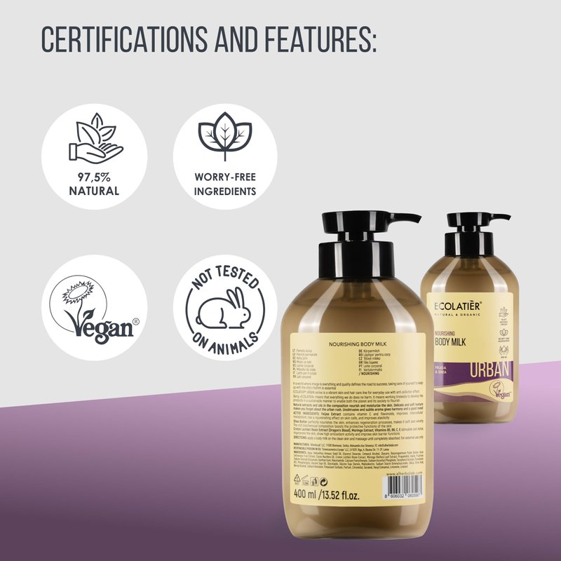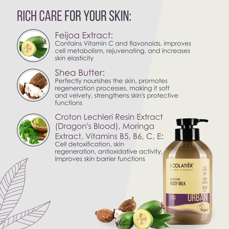 Nourish and protect your skin daily with ECOLATIER's Nourishing Body Milk, formulated to keep your skin soft, hydrated, and rejuvenated, even in a harsh urban environment. This luxurious lotion features Feijoa Extract, rich in vitamin C and flavonoids, which enhance skin’s metabolism and promote a youthful glow. Shea Butter adds deep nourishment, accelerating regeneration and leaving your skin velvety smooth. At the core of this body milk are Croton Lechleri Resin Extract (Dragon’s Blood) and Moringa Extract, offering potent antioxidants that detoxify and regenerate skin cells. Enhanced with Vitamins B5, B6, C, and E, it revitalizes the skin, improves elasticity, and delivers lasting hydration, making it perfect for women and men with dry skin. In today's fast-paced world, image and quality are key. The ECOLATIER URBAN series offers vibrant skin care with an anti-pollution effect, helping your skin withstand urban challenges. Staying true to the ECOLATIER philosophy, this body milk is crafted sustainably, promoting the well-being of both the planet and society. Made from 97.5% natural ingredients, this moisturizing body lotion is vegan certified, cruelty-free, and perfect for sensitive skin. Its lightweight texture absorbs quickly without leaving greasy residue, while its subtle, fragrance-free aroma provides harmony and relaxation. Use it daily to escape the urban rush, caring for your skin with ease. Ideal for both women and men, this natural body lotion not only restores moisture but also improves elasticity and resilience. ECOLATIER Nourishing Body Milk offers high-quality, luxurious care for maintaining healthy, beautiful skin.