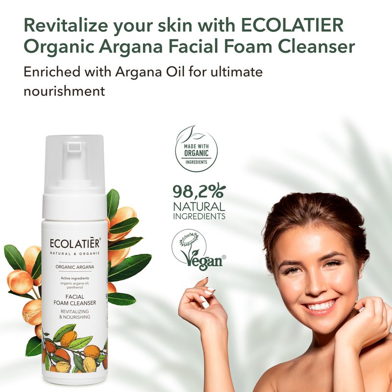 Elevate Conscious Beauty Choosing ECOLATIER Organic Argana Facial Foam Cleanser is a step towards ethical and sustainable skincare. This hydrating face wash with Vegan Certified and 98.2% Natural Origin ingredients is a Skin Care Products choice that aligns with your values. Structure: Our Organic Argana Oil is rich in Vitamin A, E, antioxidants, and omega-6 fatty acids. These attributes contribute to improved skin elasticity, reduction in fine lines, and enhanced hydration. Coupled with the active ingredient Panthenol, your skin experiences regeneration, moisturizing face wash effect, and a smoothing effect. Organic Argana Oil Excellence This Face Cleanser is loaded with vitamins and omega-6 fatty acids, delivering unparalleled nourishment to your skin. Panthenol Boost Including Panthenol in our formula ensures a ECOLATIER Hydrating Facial Cleanser effect, making your skin soft and rejuvenated. Efficient Cleansing Serving as an excellent cleansing solution, it efficiently removes makeup and impurities while nourishing your skin. Directions for Use To optimize the results, apply this Argan Oil cleanser to wet skin, lather, and rinse with warm water. Exclusively for external use. Discover the ethical and rejuvenating effects of ECOLATIER Organic Argana Facial Foam Cleanser, a truly nourishing and revitalizing experience.