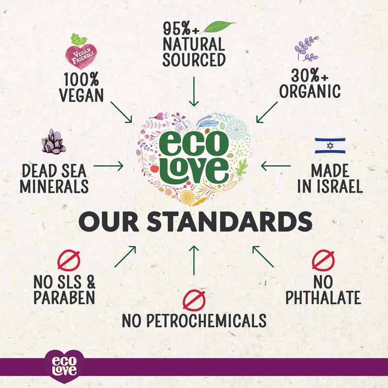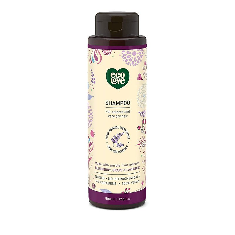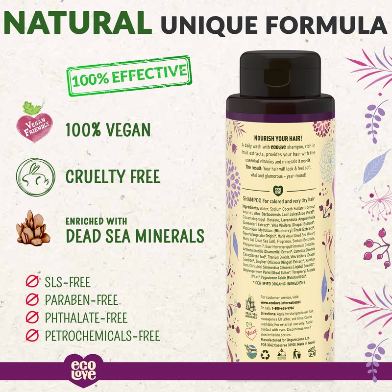 - NATURAL & ORGANIC INGREDIENTS: ecoLove Purple Collection Natural Shampoo is free from SLS, parabens and petrochemicals. 95% nature-derived ingredients (30% organic). Enriched with essential oils, organic herbs & plant extracts and 26 Dead Sea minerals.