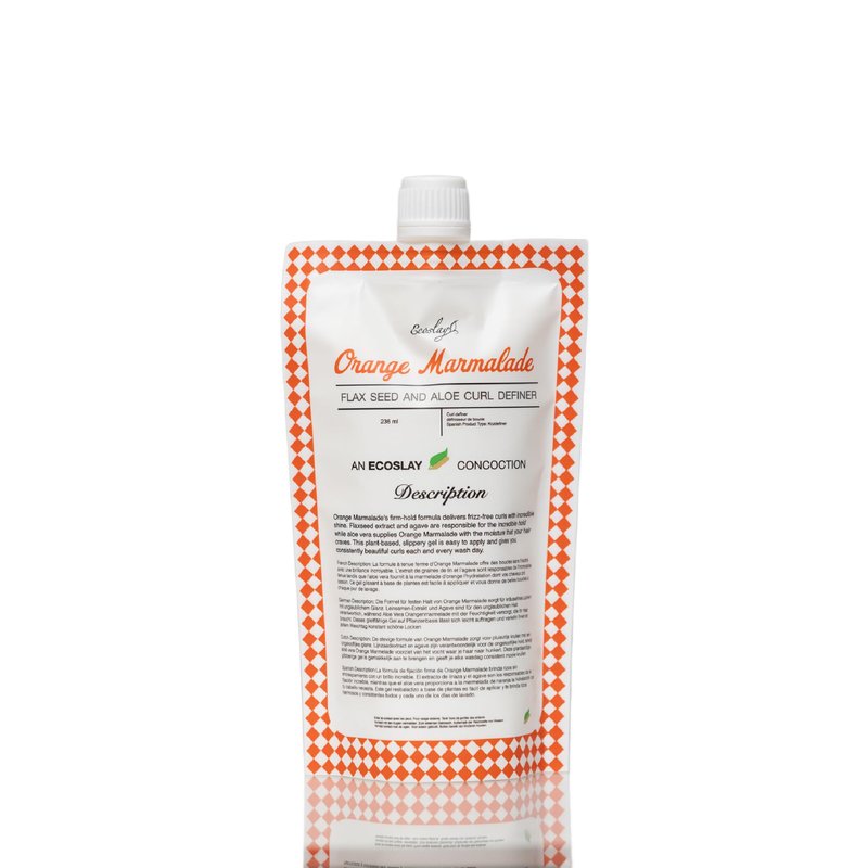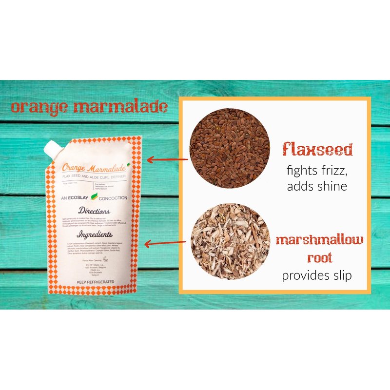 What sets Ecoslay's Orange Marmalade apart is its blend of natural ingredients. It's a plant-based styling gel that contains flaxseed extract, agave nectar extract, and pectin. These ingredients not only provide hold and definition but also nourish your hair, promoting healthier and more vibrant curls. It's like having a curl defining gel and a hair nourishing treatment in one product. Try Ecoslay's Orange Marmalade today and experience the difference of a natural, plant-based hair gel for your curls. Flaxseed extract and agave are responsible for the incredible hold while aloe vera supplies Orange Marmalade with the moisture that your hair craves, soothing and hydrating your scalp and hair. Marshmallow root extract helps to detangle and soften your curls, Vitamin E provides antioxidant protection against free radicals that can damage your hair, and xanthan gum helps to provide a light hold without weighing your curls down. Orange Marmalade also contains sweet orange essential oil, which gives this styling gel its light, delicious citrus scent. This plant-based, slippery gel is easy to apply and gives you consistently beautiful curls each and every wash day. Ecoslay's Orange Marmalade is handmade in small batches and is sustainably packaged. It's the perfect addition to your hair care routine, providing definition and hold to your curls without the use of harsh chemicals.