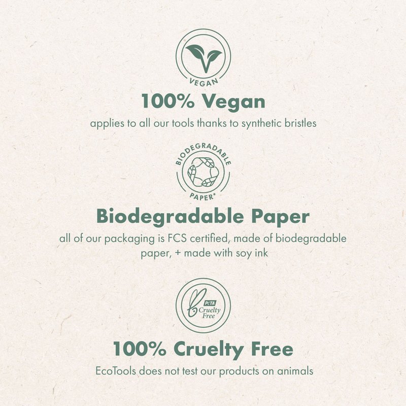 - Eco-Friendly, FSC-certified compostable paper packaging* & Always 100% vegan and PETA cruelty-free- EcoTools products are never tested on animals