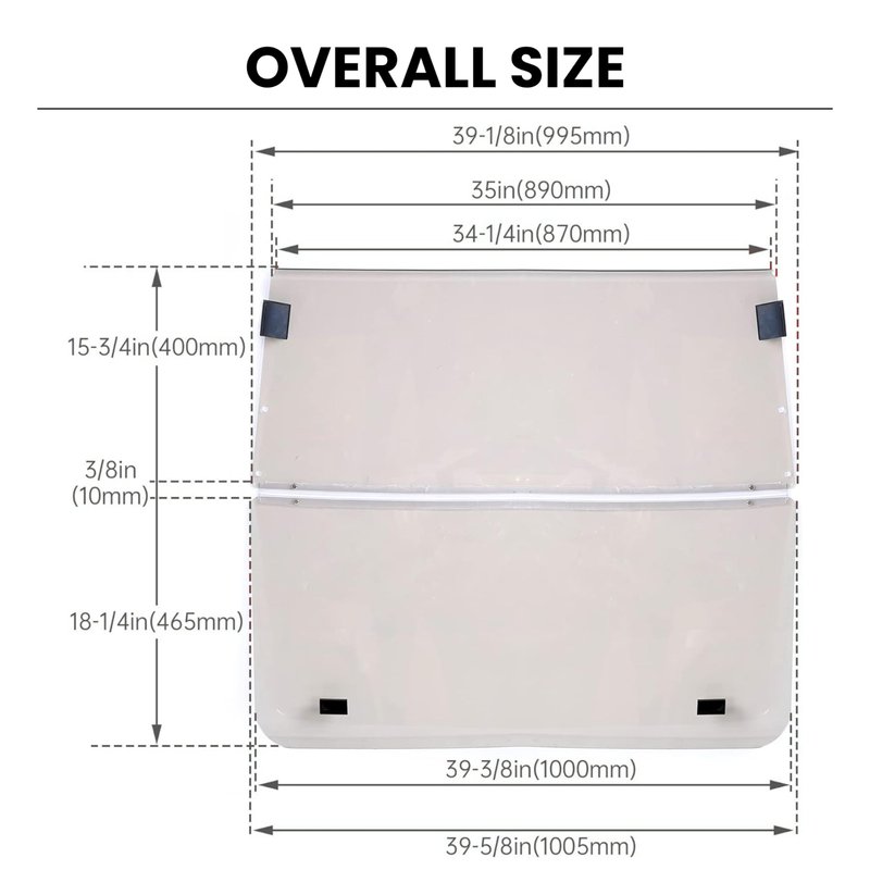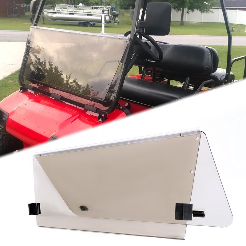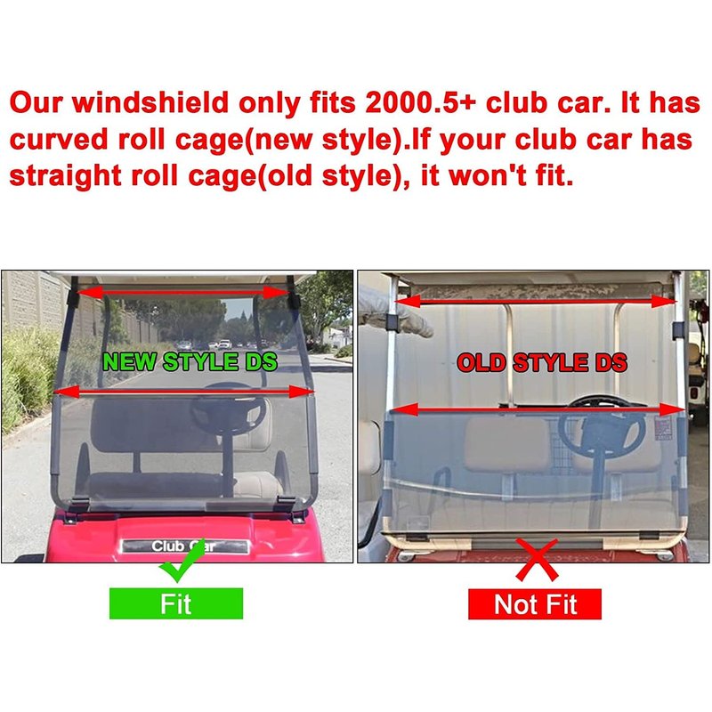 Fitment: Compatible with 2000.5 - UP Club Car DS models. Tinted Style windshield--High clarity acrylic for better visibility and for Reduced Glare and long lasting. Fold Down--for Convenience. Approximate Dimensions: 40"W X 36.5"H. NOTE: The windshiled does not compatible with limo golf cart as the front frame of the golf cart roof is rectangular. Function: The windshield can prevent raindrops, dust and other small particles from blowing into your eyes, allowing you to see the road ahead without affecting your vision, It can also prevent you from being scratched by dangerous things such as branches while driving, ensuring timeliness and safety in work and enhancing your outdoor experience. Package include 1 Windshield! ALL HARDWARE IS INCLUDED!! Easily attaches to your existing windshield frame. Quick Disconnect & Easily attaches to your existing windshield frame. No drilling or additional hardware required.
