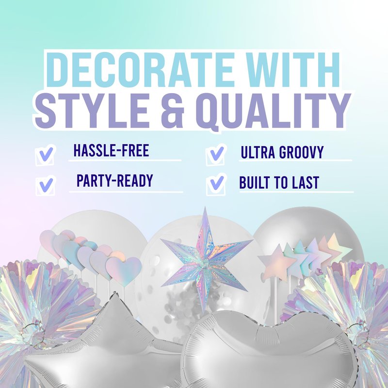 - Perfect for Every Occasion. Make your birthday party, bridal shower, baby shower, or family gathering stand out with iridescent party decorations. Our retro decor set has your party supplies covered.