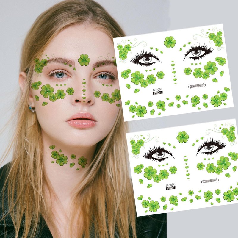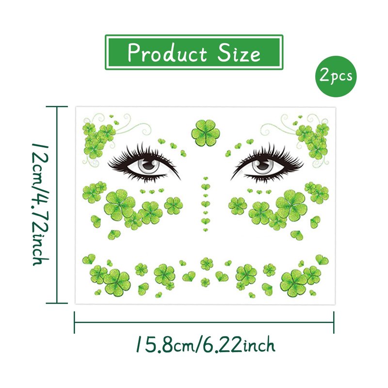 - Packaging: You will receive a 2Sheet clover tattoo sticker, measuring approximately 6.29x4.8 inches. Whether it's a St. Patrick's Day party, Children's Day event, or daily decoration, the clover face sticker can be a highlight