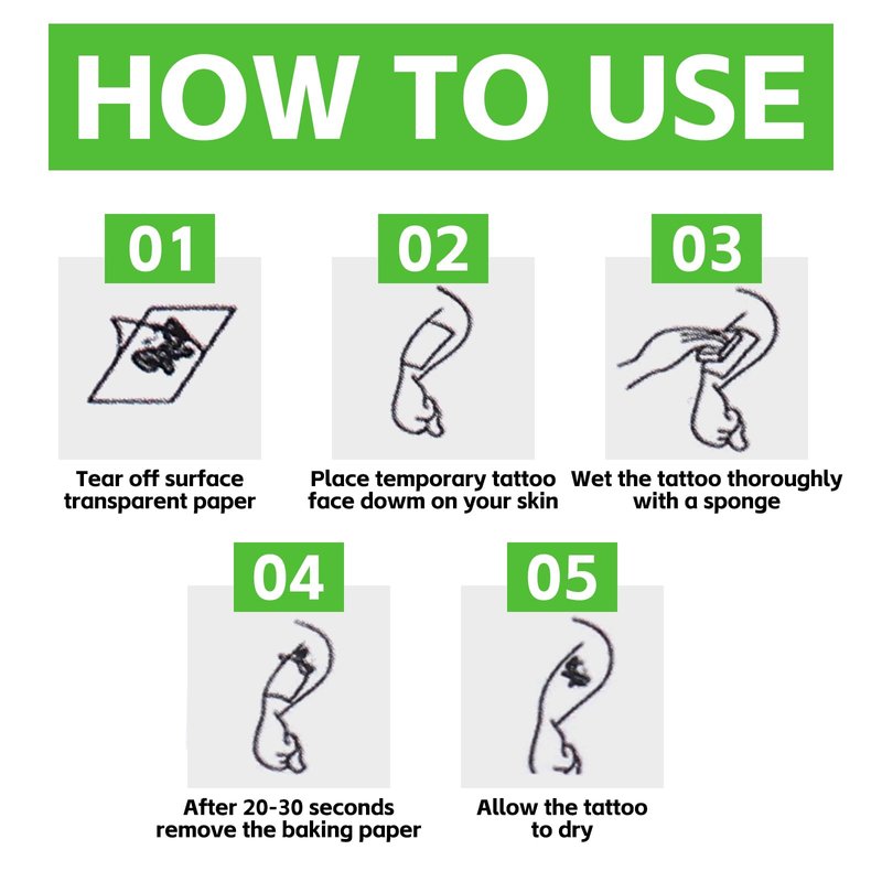 - How to Use:Cut out the tattoo of your choice and remove the clear sheet. Place the tattoo face down on the skin. Wet the tattoo thoroughly with a sponge. After 20-30 seconds, gently remove the backing paper. Allow the tattoo to dry.