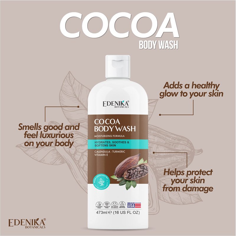 - Sustainable and Eco-Friendly – Made in the USA with sustainable packaging, Edenika Botanicals Cocoa Body Wash helps you care for your skin while supporting eco-friendly practices. Recycle after use to help protect the planet!