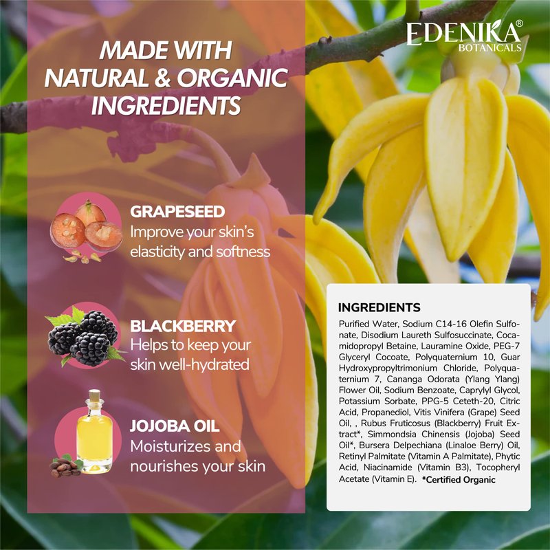 EDENIKA BOTANICALS Ylang Ylang Body Wash with Grapeseed, Blackberry & Jojoba Oil, 16 fl oz, Nourishing & Hydrating Formula, Vegan, Sulfate-Free, Paraben-Free, for All Skin Types
