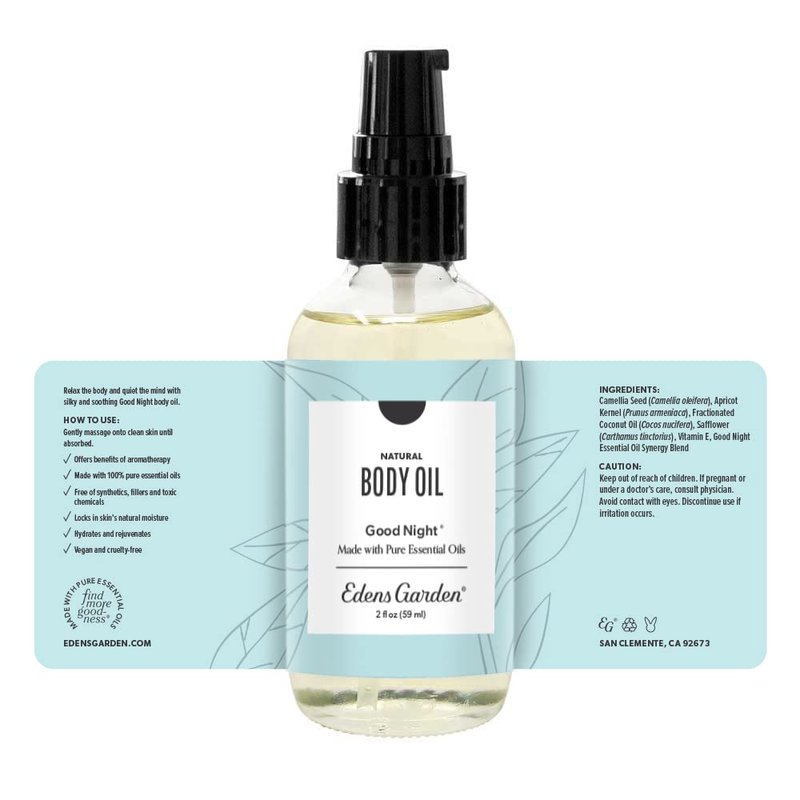 - WHAT IT CONTAINS- Our Good Night body oil offers the aromatic benefits of essential oils while locking in your skin's moisture. This vegan and cruelty-free formula is made with pure essential oils, free from synthetics, fillers, and harmful chemicals. Each 2 fl oz bottle contains a synergy of ingredients: Camellia Seed (Camellia oleifera), Apricot Kernel (Prunus armeniaca), Fractionated Coconut Oil (Cocos nucifera), Safflower (Carthamus tinctorius), Vitamin E, and the Good Night Essential Oil Synergy Blend. Ideal for nighttime use, this body oil is a luxurious addition to your routine.