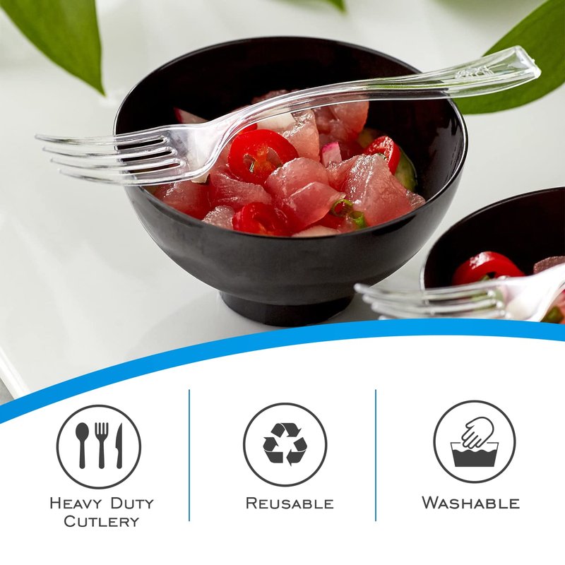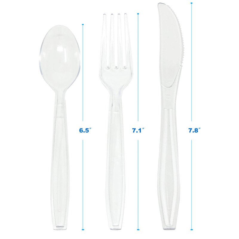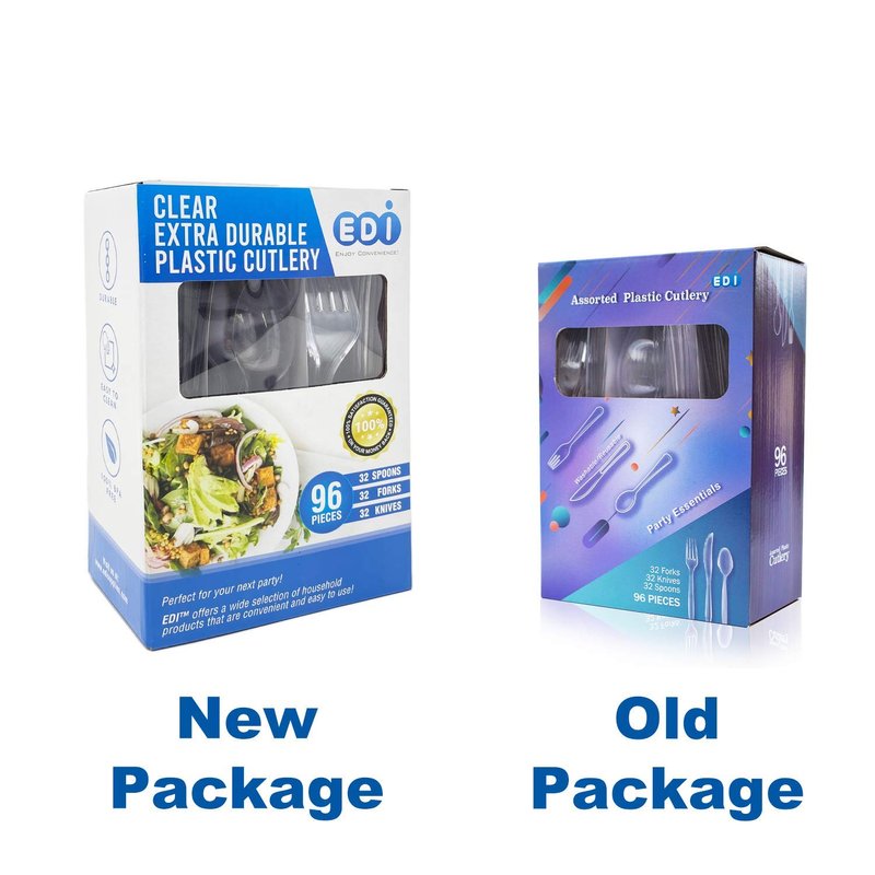 This set of assorted, heavy-duty, clear plastic cutlery is made from highly durable, BPA-free plastic. So good you will want (and can) wash and reuse it. Whether you're serving soup, steak or cake - our cutlery will stand up to the test. Disposable, for a quick and easy clean up. This set comes with 32 forks, 32 knives, and 32 spoons. For your heaviest, messiest meals, EDI has you covered.