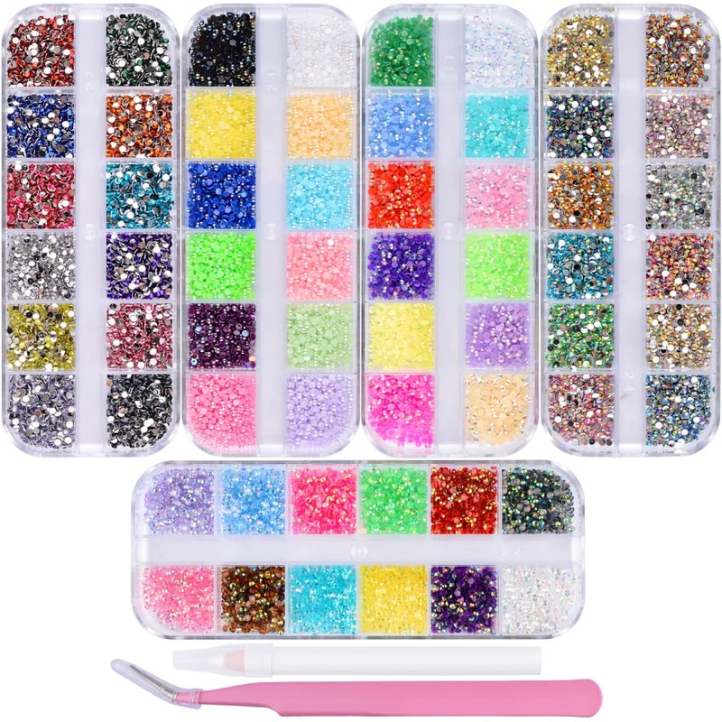 editTime 5 Boxes Shiny Colorful Nail Art Rhinestones Kit Crystals AB Flatback Jelly Mermaid Pearl Rhinestones Stones Gems with Pick Up Pen and Curved Tweezer (2mm)
