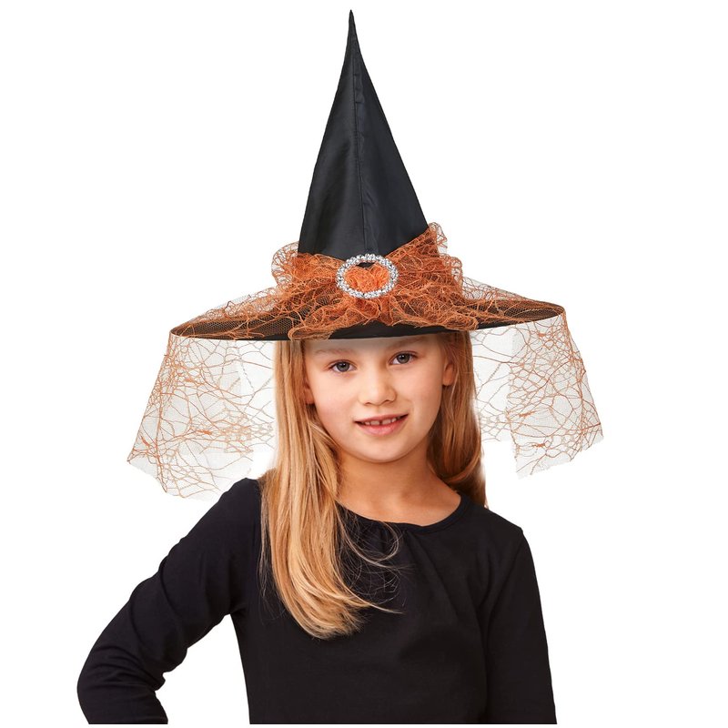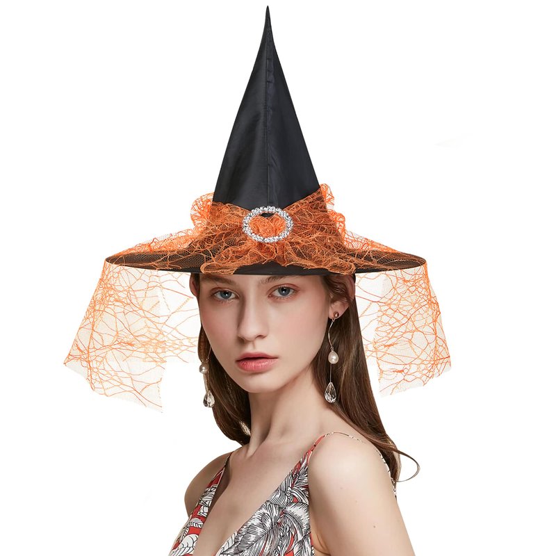 Edoneery Halloween Witch Hat for Women, Mesh Lace Fancy Dress Wizard Costume Accessory for Cosplay Parties(Orange)