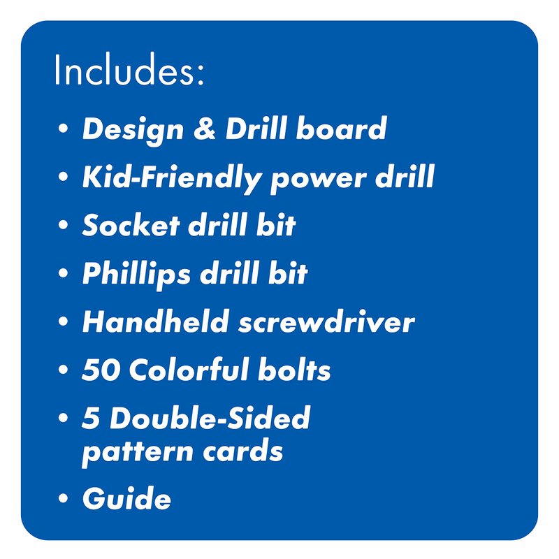 - EXPERIENCE THE THRILL OF THE DRILL: Kids power up their imaginations and build coordination skills as they use the kid-friendly drill & bolts to match the included design cards or create their own pictures, patterns, and shapes