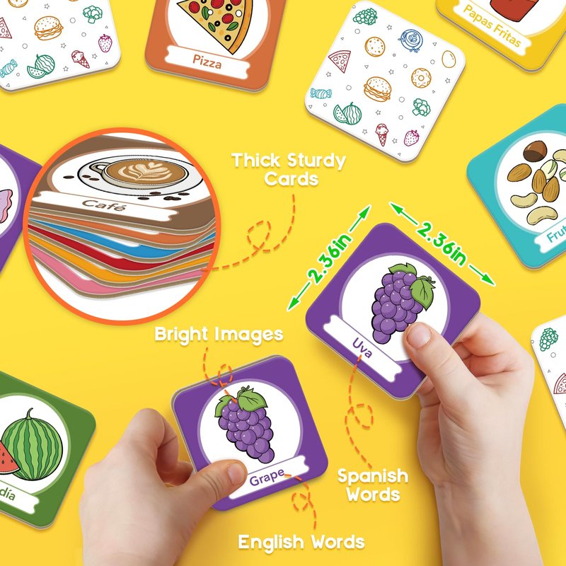 - Fun and Interactive: This bilingual matching card game features 28 pairs of cards, providing a fun and effective way for kids to learn Spanish while matching simple words.