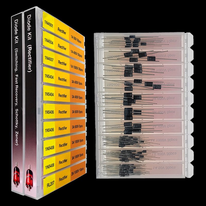 Rectifier Diode 30 Pcs 1N4001 (1A 50V) 30 Pcs 1N4004 (1A 400V) 30 Pcs 1N4007 (1A 1000V) 10 Pcs 1N5404 (3A 400V) 10 Pcs 1N5406 (3A 600V) 10 Pcs 1N5408 (3A 1000V) 10 Pcs RL207 (2A 1000V) Switching Diodes 40 Pcs 1N4148 (200mA 100V) Fast Recovery Diode 10 Pcs FR107 (1A 1000V) 10 Pcs FR207 (2A 1000V) 10 Pcs UF4007 (1A 1000V) Schottky Diodes 10 Pcs 1N5817 (1A 20V) 10 Pcs 1N5819 (1A 40V) 10 Pcs 1N5822 (3A 40V) Zener 10 Pcs BZX55C5V1 (0.5W 5.1V) 10 Pcs BZX55C12V (0.5W 12V)