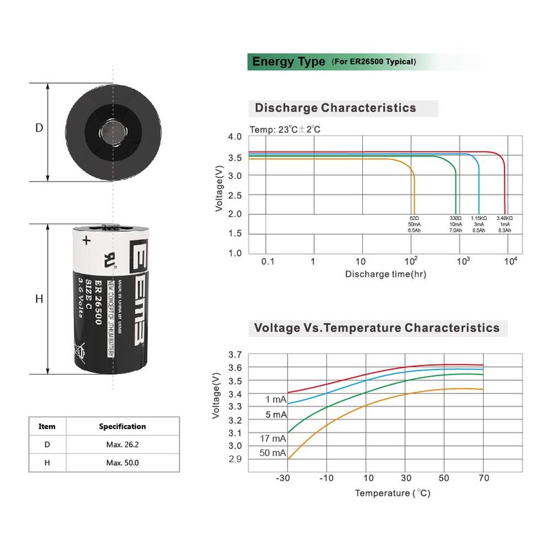 - BASIC INFO—3.6V non-rechargeable C size lithium thionyl chloride battery; 9000 mAh; 26*50mm/1.02*1.968 inch, wide range of temperatures -55°C to +85°C; most suitable for low power consumption devices. please check carefully if the ER26500 battery is the size you need for your electronic device before purchasing.