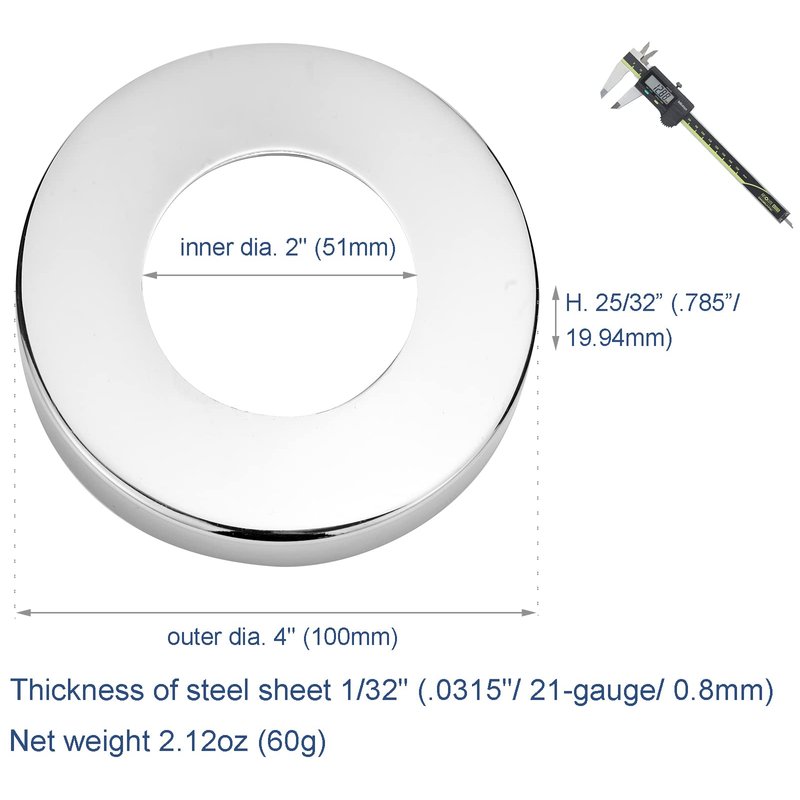 - Specification: inner diameter 2" (51mm), outer diameter 4" (100mm), thickness of steel sheet 1/32" (0.0315"/ 21-gauge/ 0.8mm), net weight 2.12oz (60g), material type 304 stainless steel