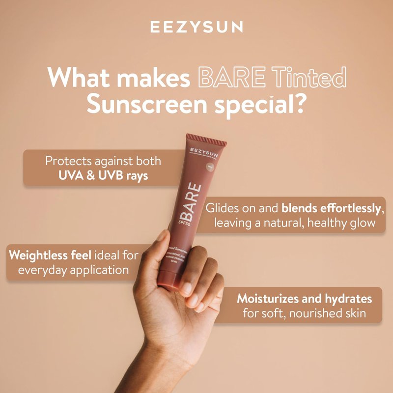 - Lightweight Hydration: With Hyaluronic Acid to attract moisture, Aloe Vera to soothe, and Kalahari Melon to refresh, EEZYSUN BARE Tinted Sunscreen SPF 50 leaves your skin feeling moisturized and smooth
